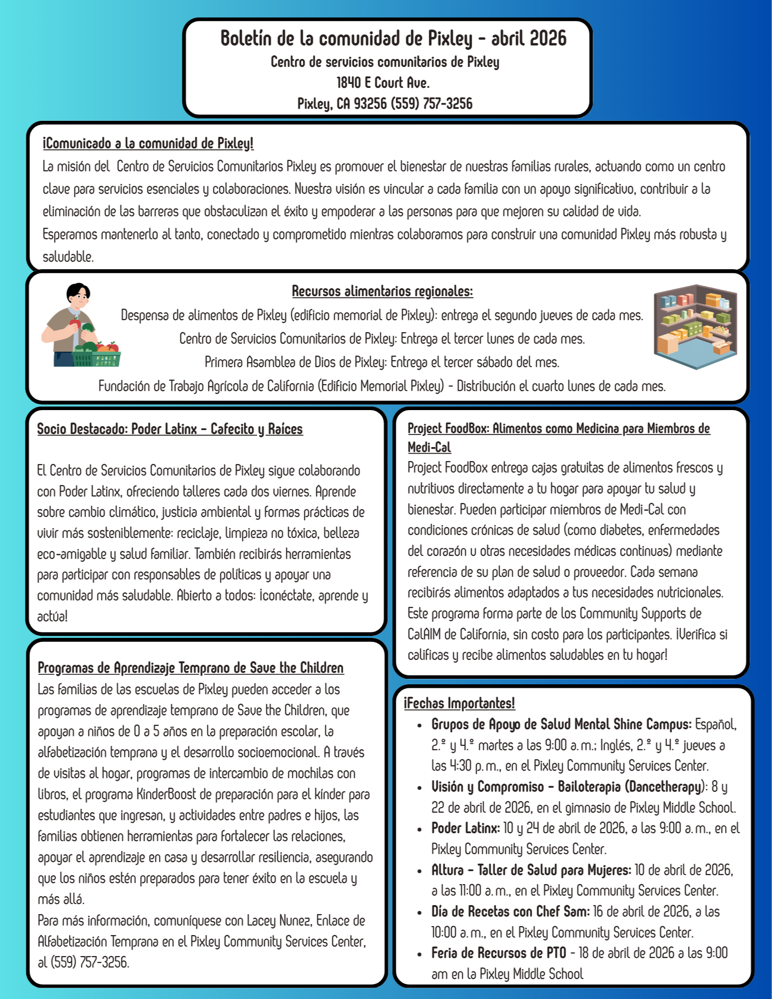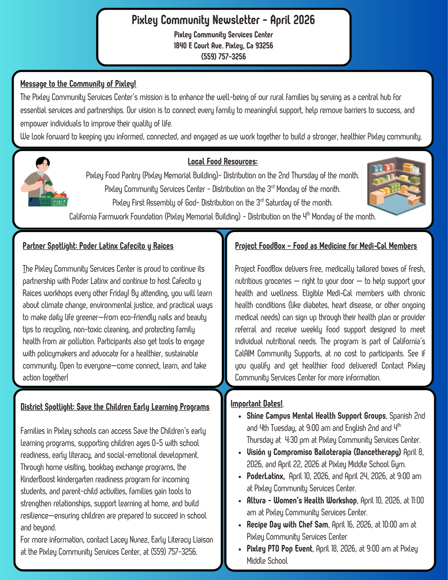The Pixley Union School District Community Services Center helps engage, educate, and inform members of our school community on available resources. We look to improve educational outcomes of our students and provide families in our community tools to improve their quality of life.